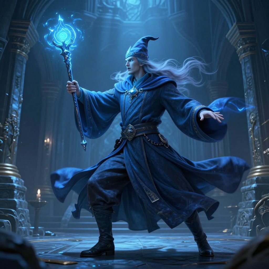 Magician pose reference, dynamic pose of a wizard holding a glowing staff and performing an incantation, robes fluttering in an ethereal wind, set in an ancient stone chamber illuminated by blue arcane light, highly detailed fantasy illustration