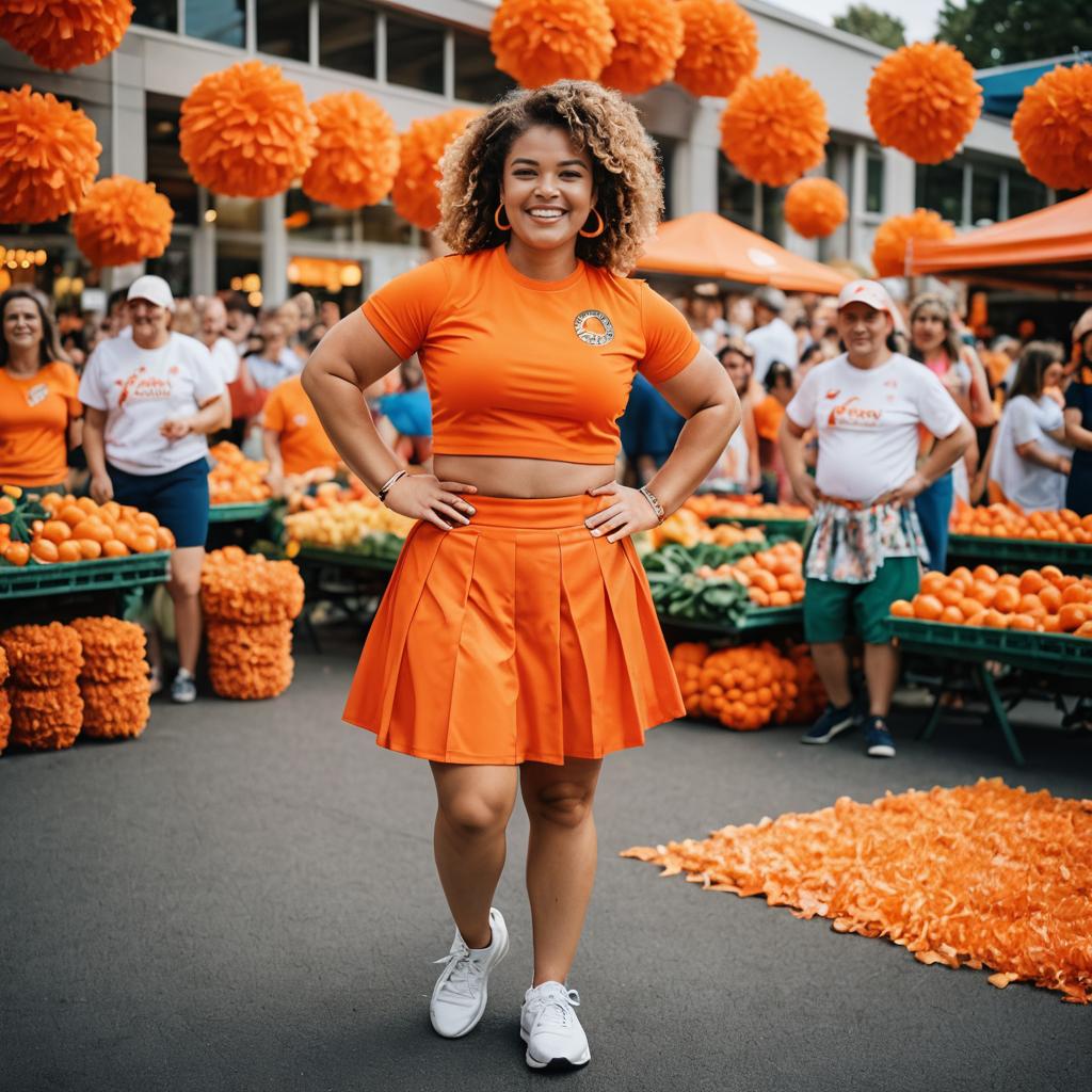 Photo of a Chubby Build woman, Short Curly, cheerleader outfit, pleated Bright Orange skirt, crop top in Cotton, vibrant colors, polyester, athletic style, casual sneakers, pom-poms, team logo, energetic, youthful, farmers market, festival flair