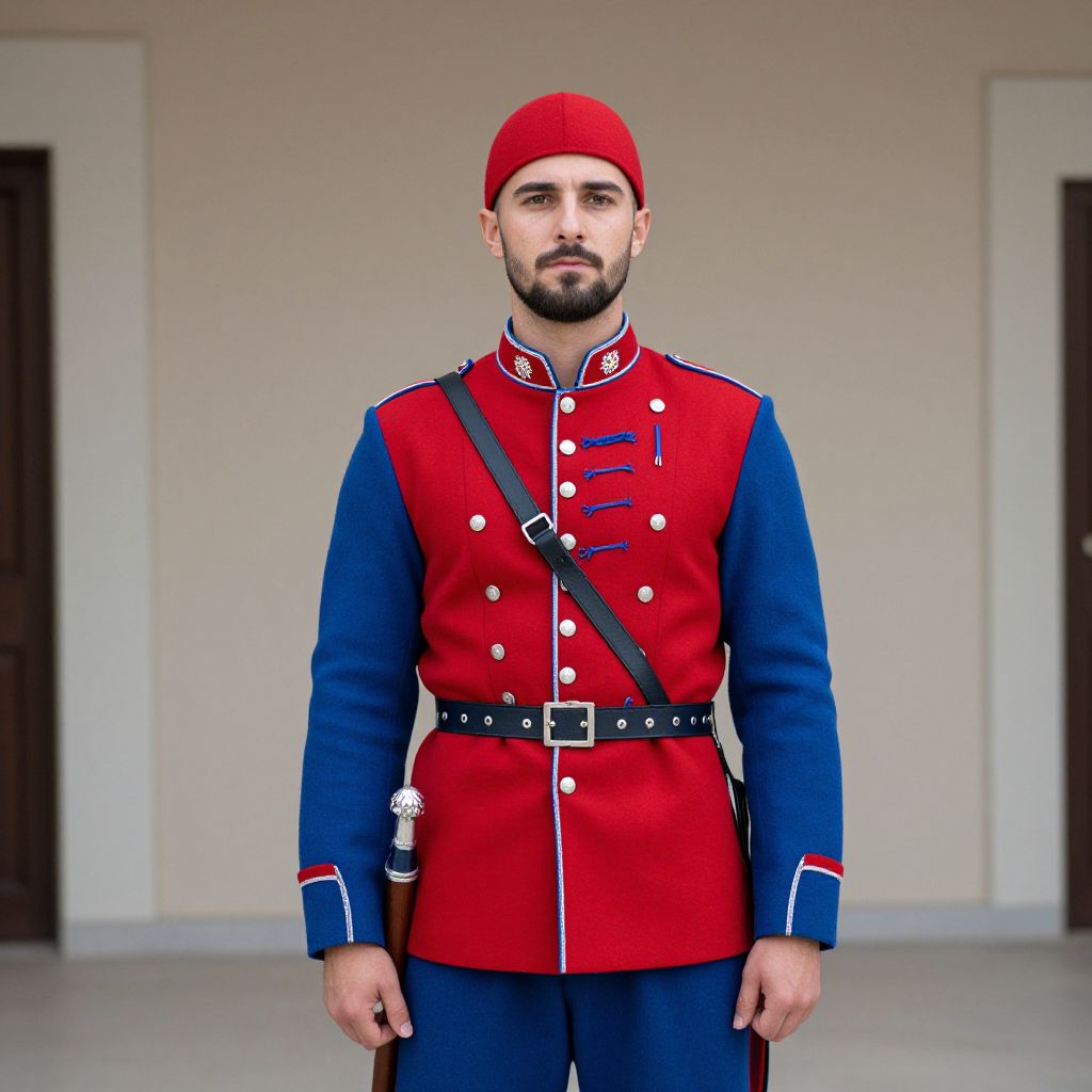 Photograph of a bearded man with a light olive skin tone, wearing a red and blue military-style uniform. The uniform features a red jacket with white buttons, blue sleeves, and a black belt with a silver buckle. A black strap crosses his chest. He also wears a red cap and has a serious expression. The background is a plain, beige wall with two dark doorways on either side. The uniform has white trim and a white emblem on the left sleeve. The lighting is even, highlighting the uniform's vibrant colors.