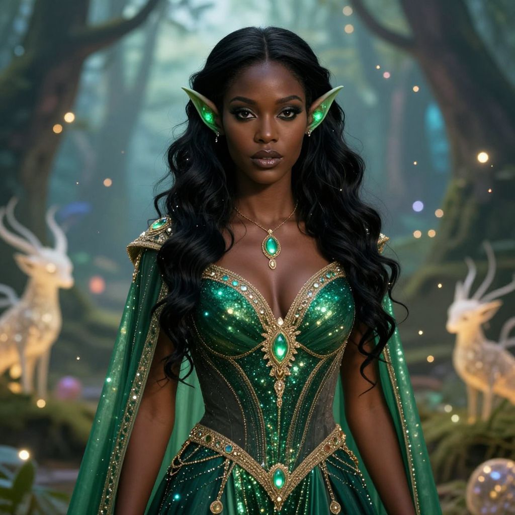 Photorealistic digital art of a dark-skinned, elf-like woman with long, wavy black hair and glowing green elf ears. She wears a shimmering green and gold dress with a plunging neckline, adorned with emerald jewelry, including a pendant and earrings. The background is a mystical forest with soft, bluish-green light, blurred trees, and ethereal glowing deer. Her confident stance and piercing gaze add a magical, enchanting aura to the scene. The image blends fantasy elements with realistic textures, creating an otherworldly, fairy-tale atmosphere.
