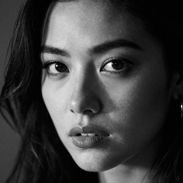 Black-and-white close-up photograph of a young woman with medium-length dark hair, striking eyes, and slightly parted lips, illuminated from the left.