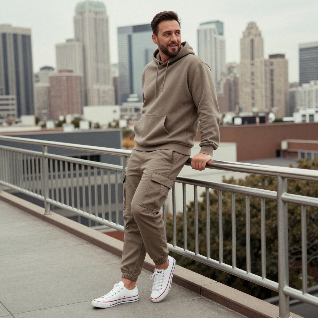 A man, relaxed fit hoodie, tapered cargo pants, white low-top sneakers, earthy tones, urban rooftop, sleek metal railings, panoramic city skyline, chromogenic film style, leaning against the railing, casual smile, looking out at the city.Man has masculine face and piercing eyes