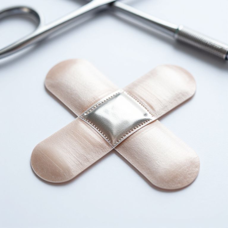 Silver bandaid in a medical setting, shiny and sterile appearance, placed on surgical instruments, bright clinical lighting, high detail with reflections and metallic shine