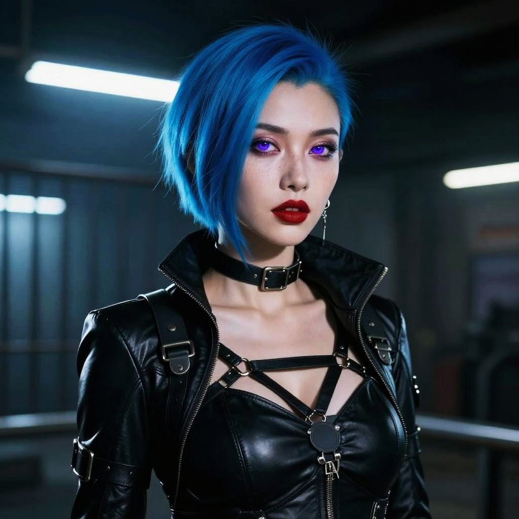 Realistic photo.Artistic photo of a young woman with blue hair, featuring a fierce expression and bold makeup. Styled with neon lighting in a playful, dynamic composition inspired by Andy Warhol. realistic photo