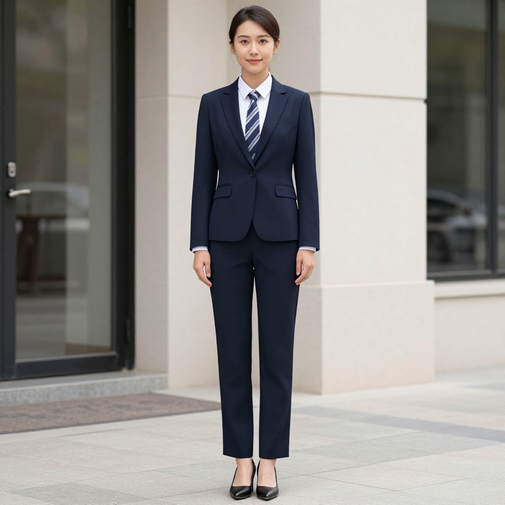 Photograph of an Asian woman standing confidently in front of a modern office building. She has fair skin, dark hair tied back, and wears a dark navy blue business suit with a white dress shirt and a matching navy and white striped tie. She is also wearing black pointed-toe heels. The background features large glass windows and a white concrete pillar. The ground is paved with light gray tiles. The woman's expression is neutral, and she stands with her hands by her sides. The image has a professional, polished look.