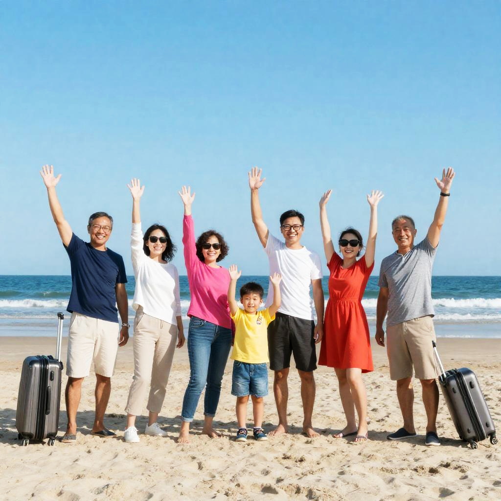 Photograph of a group of 11 people on a sunny beach. Elderly couple sits on a yellow surfboard above group, smiling. Group wears diverse casual outfits, standing with arms raised. Background: clear blue sky, palm trees, distant green island. Elderly man has short white hair, blue shirt, white pants. Elderly woman has dark hair, yellow floral dress. Group includes black-haired woman in leather jacket, red shirt, black-haired man with red shirt, brown-haired woman with pink jacket, and others. Surfboard held by two people below. Bright, cheerful atmosphere.