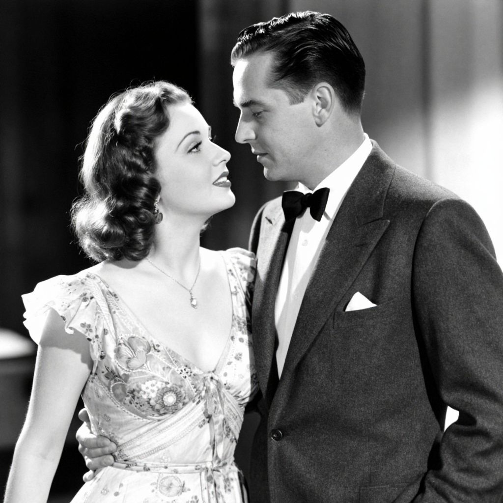 A vintage black-and-white illustration reminiscent of 1930s Hollywood glamour, featuring a man in a classic suit and a woman in an elegant floral dress, captured in a dramatic, high-contrast lighting style that evokes the romantic atmosphere of \"Gone with the Wind.\