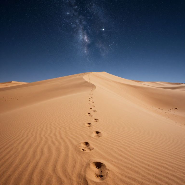 Footprints leading upwards along a vertical desert vanish into an upside-down sea of stars, where gravity flows the wrong way.