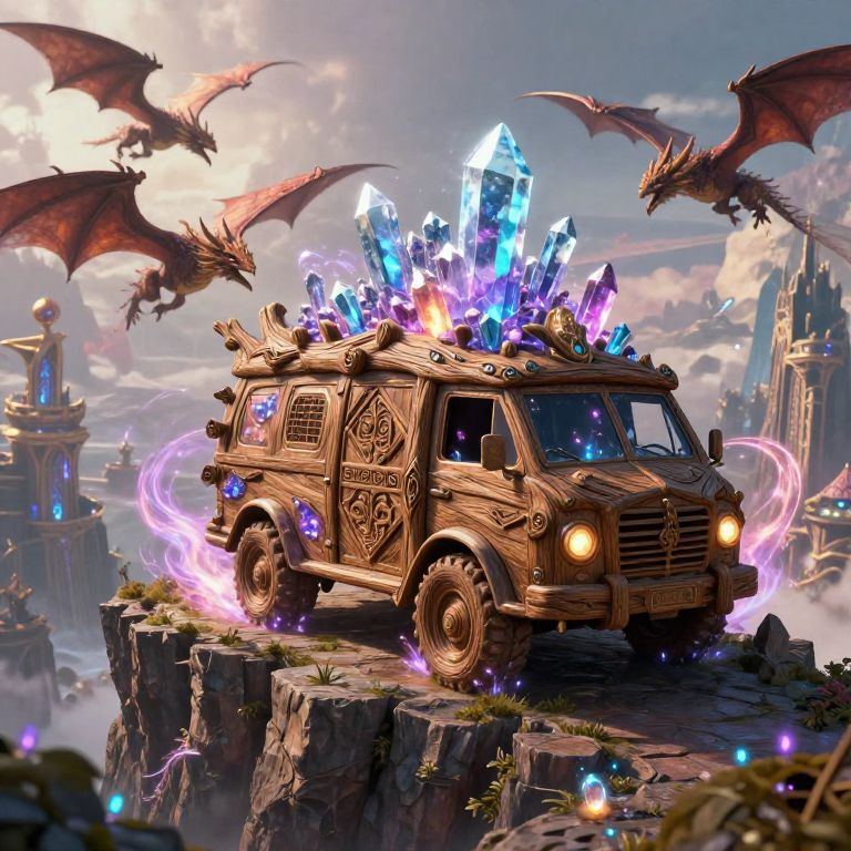 Epic fantasy van art depicting an ancient van carved from enchanted wood, infused with glowing crystals and surrounded by swirling magical energy, situated on a cliff overlooking a vast fantasy kingdom, with dragons soaring in the background, rich in color and fantasy elements.