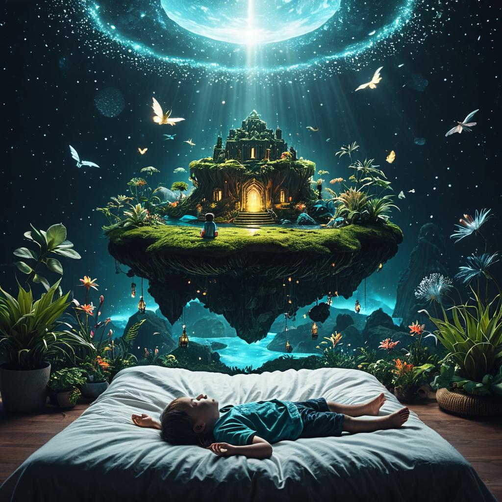 One young woman laying flat on a bed meditating and imagining a mystical forest filled with glowing fireflies and ancient trees, the scene looks spiritual, dreamy, and magical, with a cinematic ultra-realistic rendering in 8k, dramatic lighting, extreme detail.