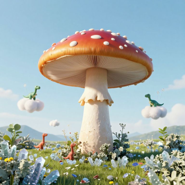 A towering mushroom cap becomes a floating meadow, where tiny dinosaurs ride clouds of spores above a sea of crystalline lichen.