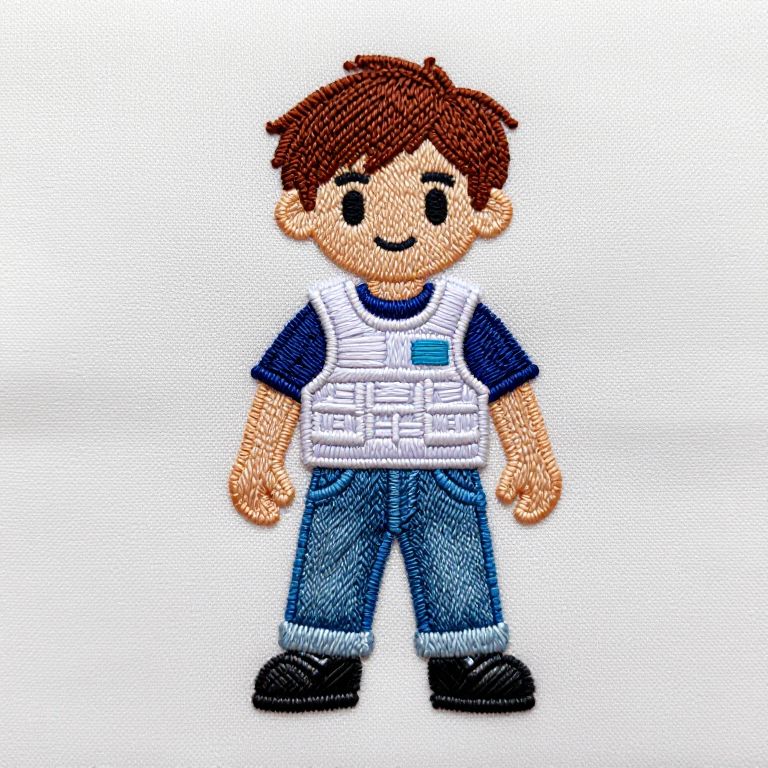 Embroidery /Imagine small character in jeans and t-shirt, he wears a small white armor that looks like a bulletproof vest,
