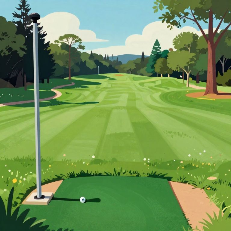 Postprocessing colorful Dan Mumford digital art depicting the view from the first teebox of a beautiful disc golf course. low-detail, procreate, mary blair,