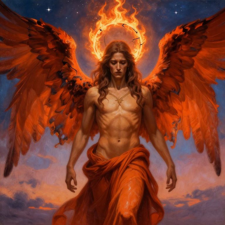 Digital art of a muscular, shirtless angel with fiery orange wings and a halo, wearing a red cloth, against a starry sky.