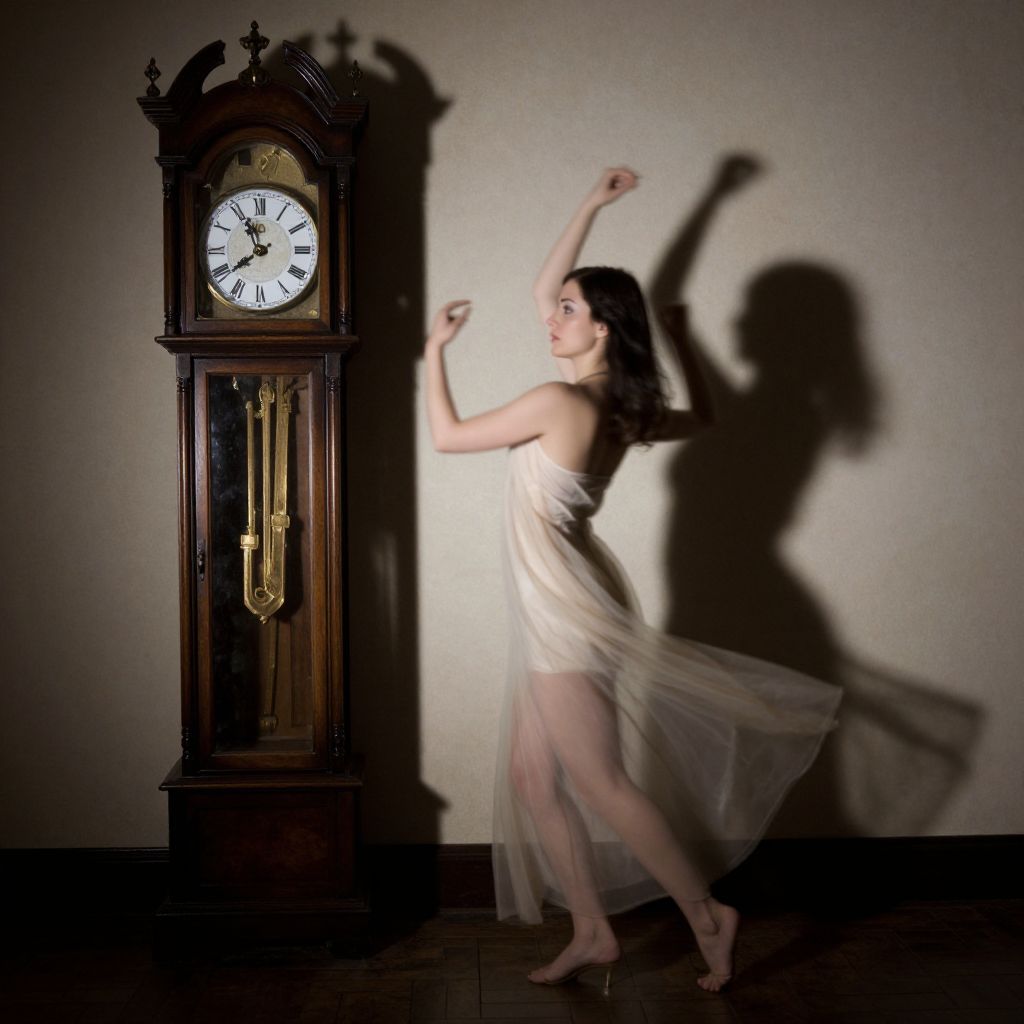 Photograph of a dark-haired woman in a sheer white dress, dancing beside a tall, wooden grandfather clock, casting dramatic shadows on a plain wall.