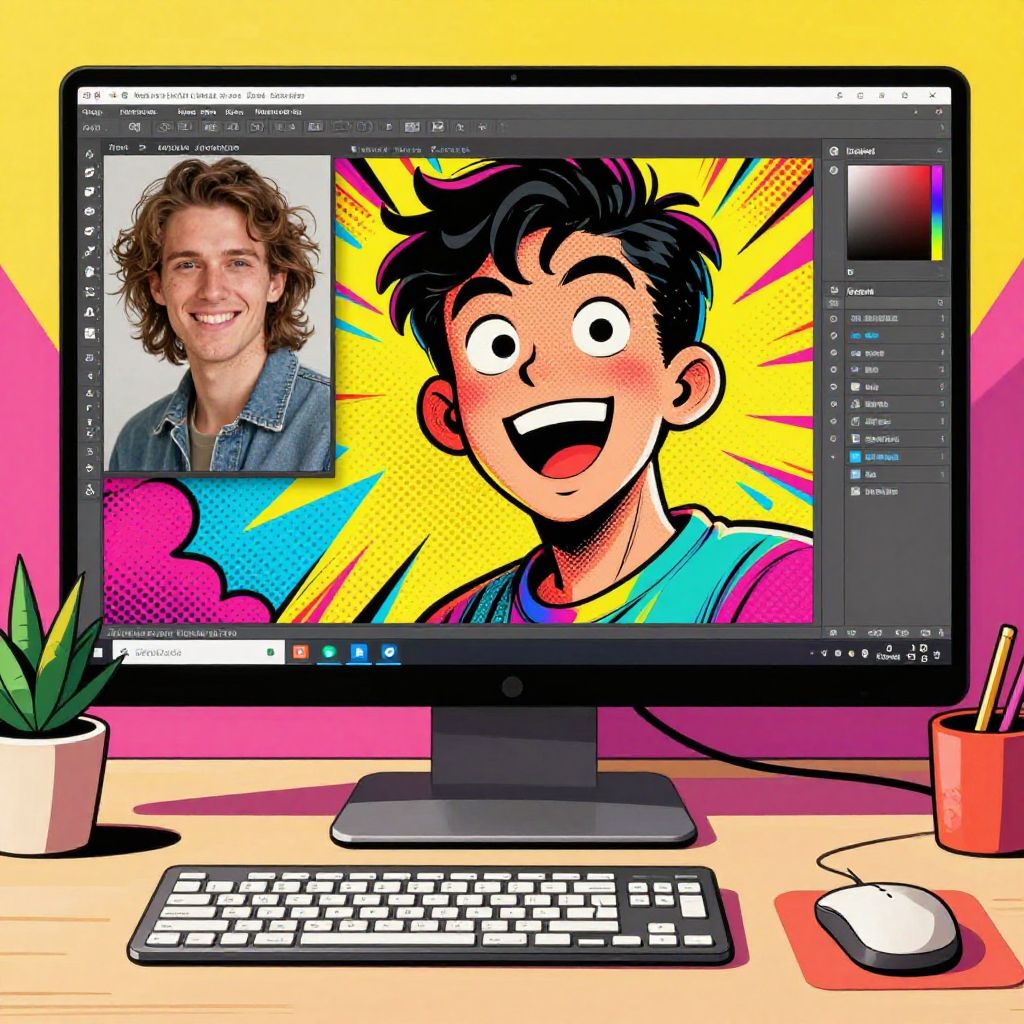 Turn photo into illustration online free, comic book style, bold outlines, halftone shading, dynamic expression, colorful pop art palette, desktop with software open showing transformation progress, vibrant and fun visual atmosphere