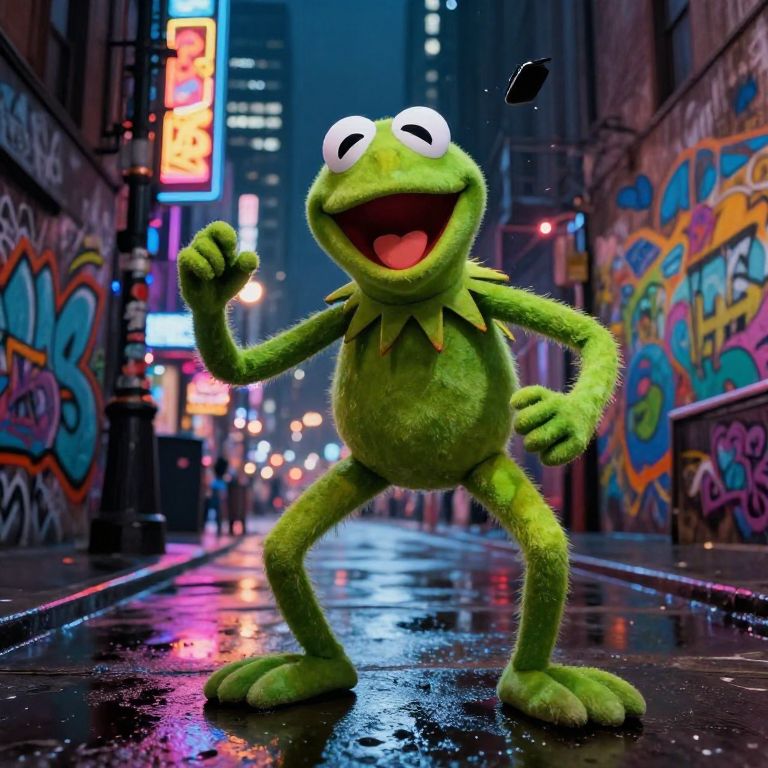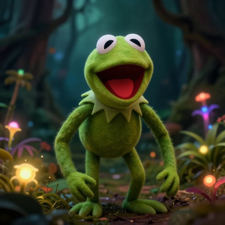 Photograph of Kermit the Frog underwater, smiling widely with wide eyes, green skin, and bubble trail above, surrounded by blue water.