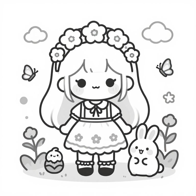 The image is a black-and-white vector illustration featuring a chibi-style character in a springtime or Easter theme. The character, a young girl with long, flowing hair adorned with a large, floral headband, stands in a garden setting. She is dressed in a cute, floral-patterned dress with a scalloped hem and matching socks. To her right, a small, cute rabbit with bunny ears and a smiling face is sitting on the ground, while a small, round creature with a smiling face and a tuft of hair is nearby. Butterflies and clouds float in the background, adding to the whimsical and serene atmosphere. The overall composition is balanced, with the character centrally positioned and the surrounding elements creating a harmonious and playful scene.