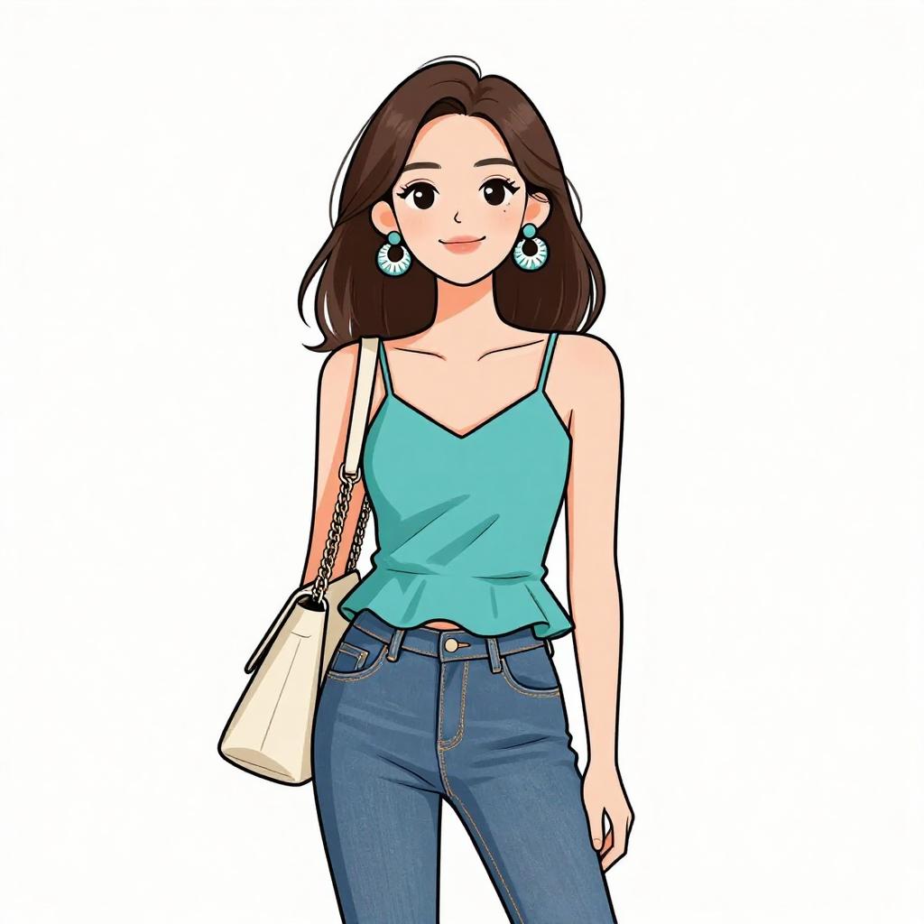 Woman with pretty face and pretty hair. smiling Woman, casual chic, solid teal spaghetti strap top with a relaxed fit and flared hem, paired with fitted blue denim jeans, accessorized with large circular patterned earrings and a light beige shoulder bag with a chain strap. --sref 1467