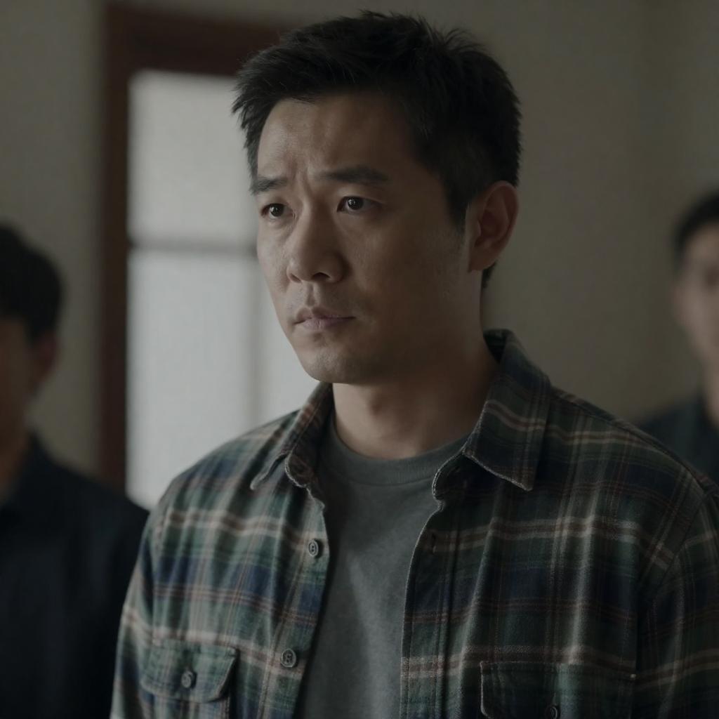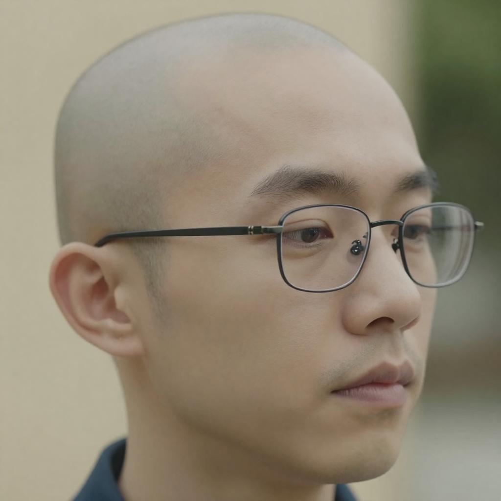 Photograph of a man with a bald head, wearing a red baseball cap with a white and red checkered band, and a gold necklace. He has a serious expression, slightly upturned face, and a small bandage on his right cheek. Background shows a cloudy sky through a window. Right side has a dark wooden object. Man is centered, with the background slightly blurred.