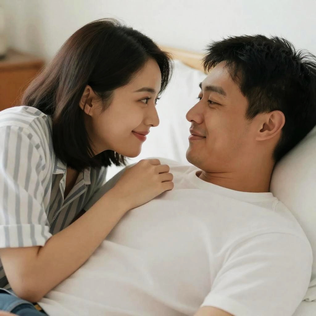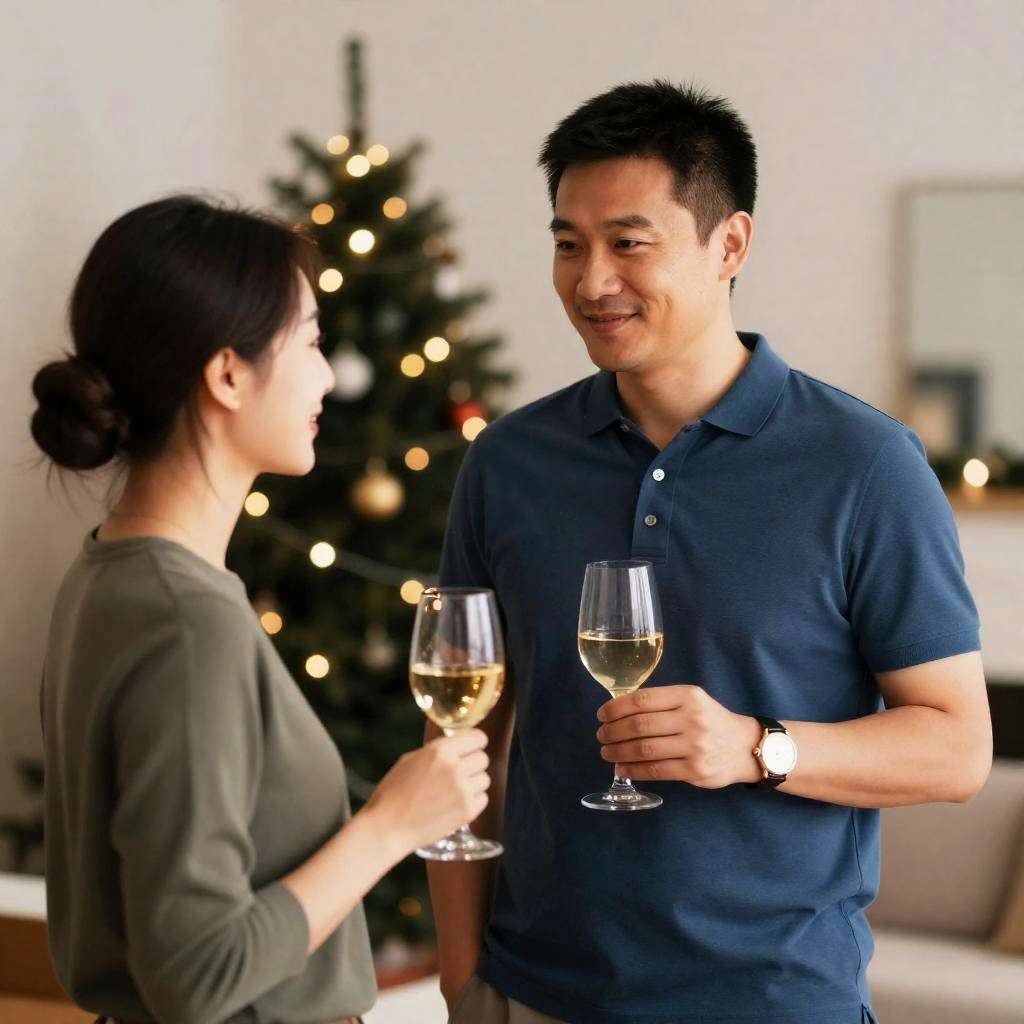 Photograph of two people in a warmly lit room. A man with short black hair, medium build, and a blue polo shirt holds a glass of wine in his right hand. A woman with dark hair in a bun, wearing a green long-sleeve top, holds a glass of wine in her left hand. Christmas tree with lights in the background. Man has a slight smile, woman faces him. Blurred bokeh lights in the background. Man wears a watch on his left wrist.