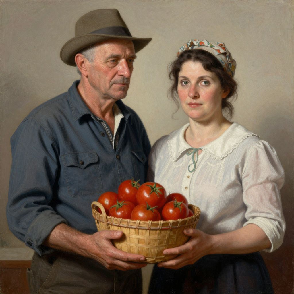 This photograph-like digital painting depicts an elderly man and a young woman standing side by side, holding a wicker basket filled with ripe red tomatoes. The man, with a weathered face, gray hair, and a brown hat, wears a dark blue, long-sleeved shirt. The woman, with fair skin and dark curly hair, adorned with a floral headband, is dressed in a white, long-sleeved blouse with lace detailing. They stand against a plain, beige background. The man's expression is stern, while the woman looks slightly nervous. The texture of the clothing and the wicker basket is realistic, highlighting the artist's attention to detail.