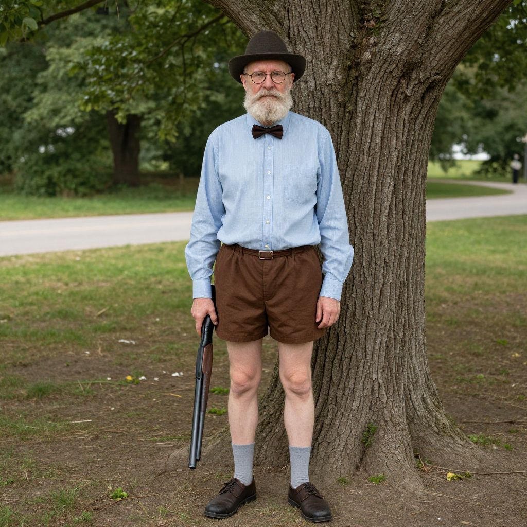 Funny costume olds, male focus, 1boy, hat, facial hair, shorts, solo, beard, full body, old, outdoors, socks, old man, tree, shirt, shoes, glasses, looking at viewer, gun