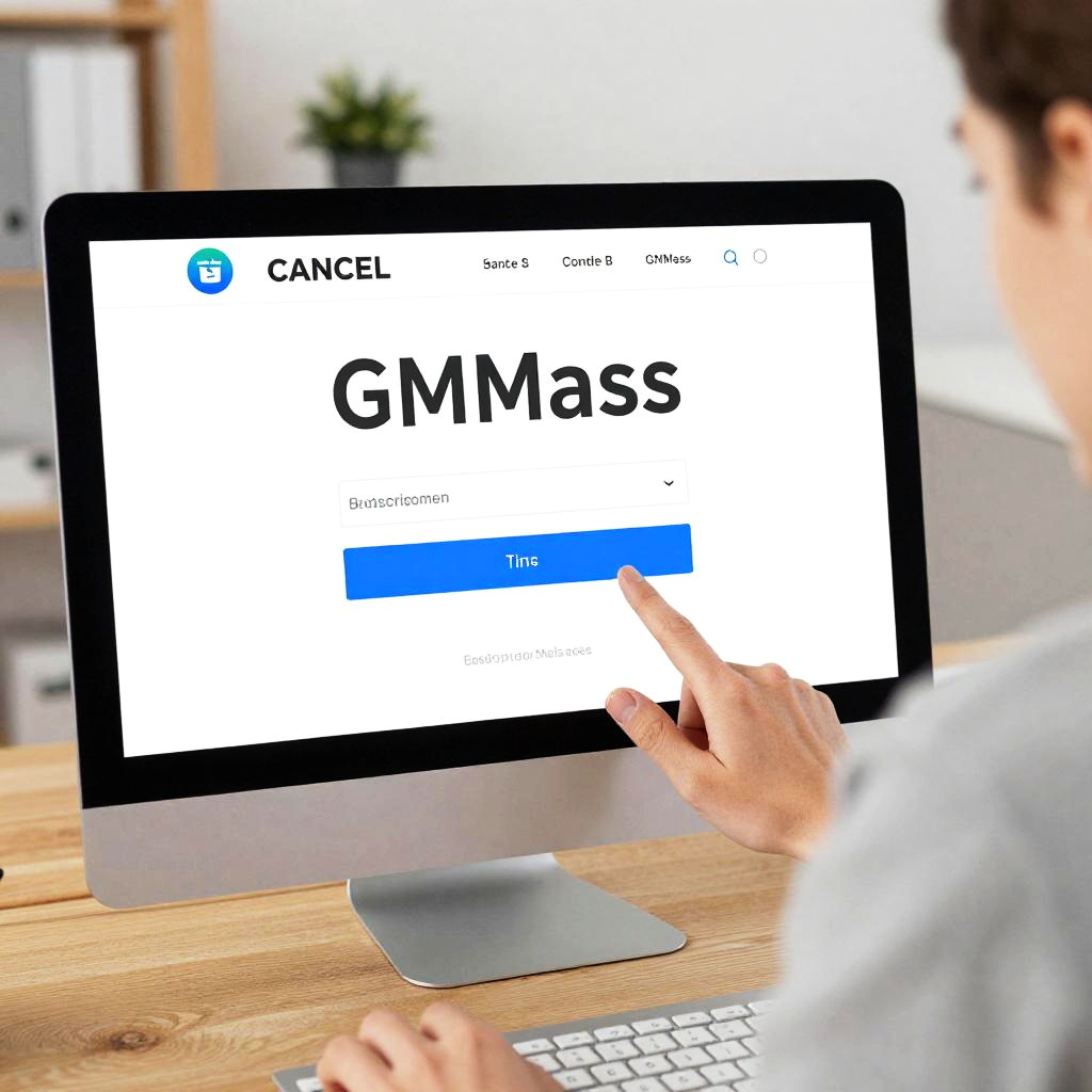 Creative representation of how to cancel GMass subscription, person interacting with subscription management page on computer, office desk environment with focused expression, high detail, pastel color scheme, productivity theme.