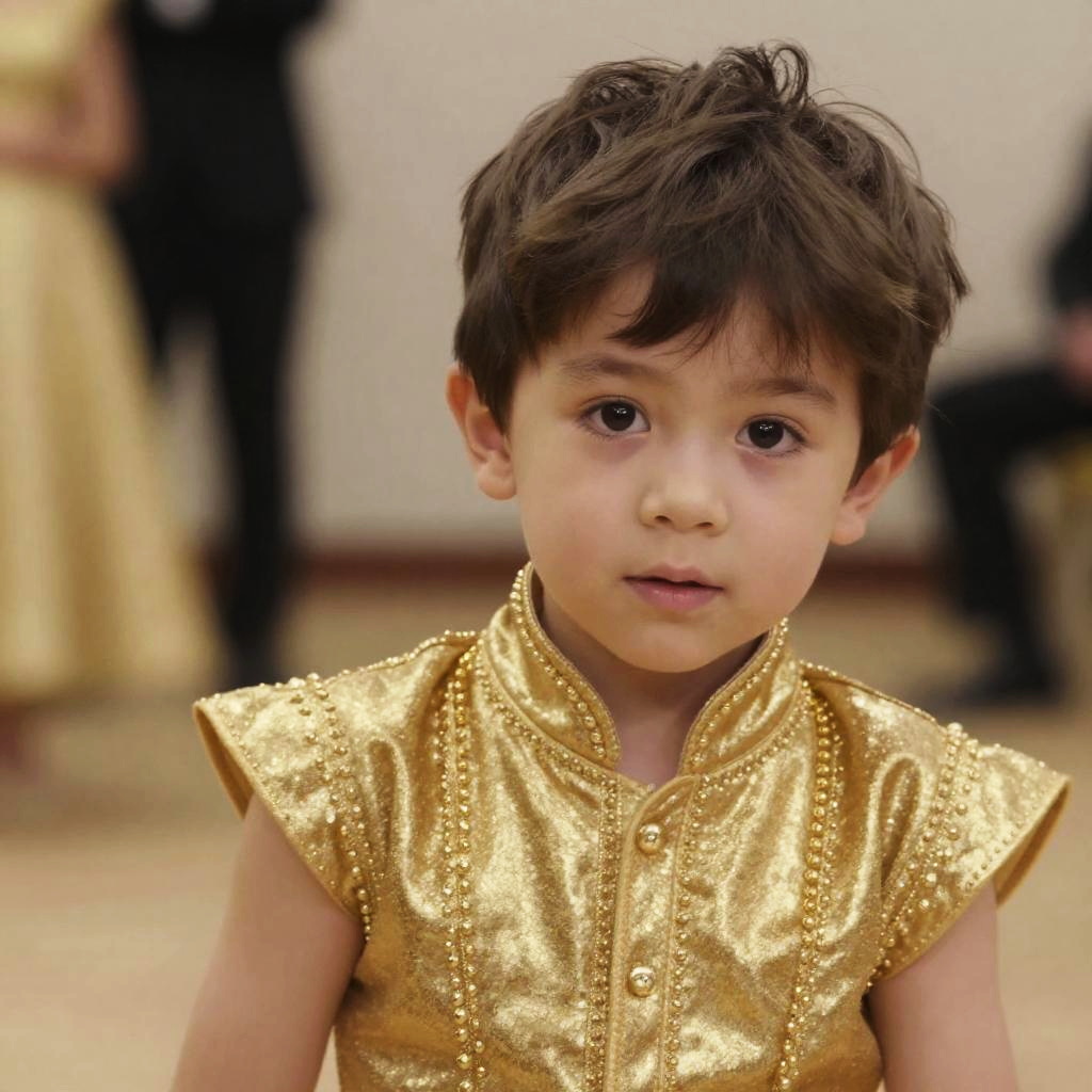 Gold Fancy Dress Boy, a close up of a young boy in a gold outfit