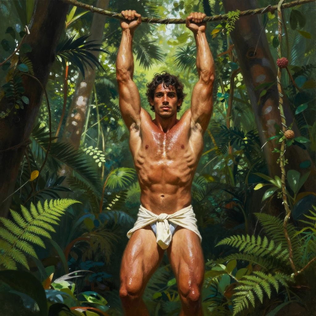 A muscular, shirtless man with dark, wavy hair hangs by his hands from a jungle vine. He's wearing only a white loincloth, showing off his chiseled abs and strong arms. His skin is tan and glistening with sweat. The dense jungle around him is lush with green foliage, ferns, and dappled sunlight filtering through the trees. It's a dynamic, vibrant painting.