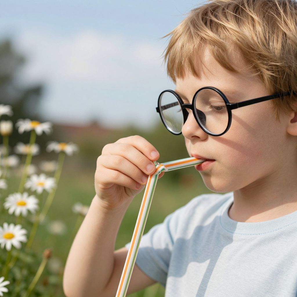 Photograph of a young child with light brown, wavy hair and fair skin, standing outdoors in natural light. The child has large, dark brown eyes and a neutral expression. Centered on their forehead is a pink, round button, positioned as if attached to the face. The background is blurred, showcasing greenery and sunlight. The child wears a grey shirt. The image has a soft focus, emphasizing the child's face and the button while creating a gentle, warm atmosphere.