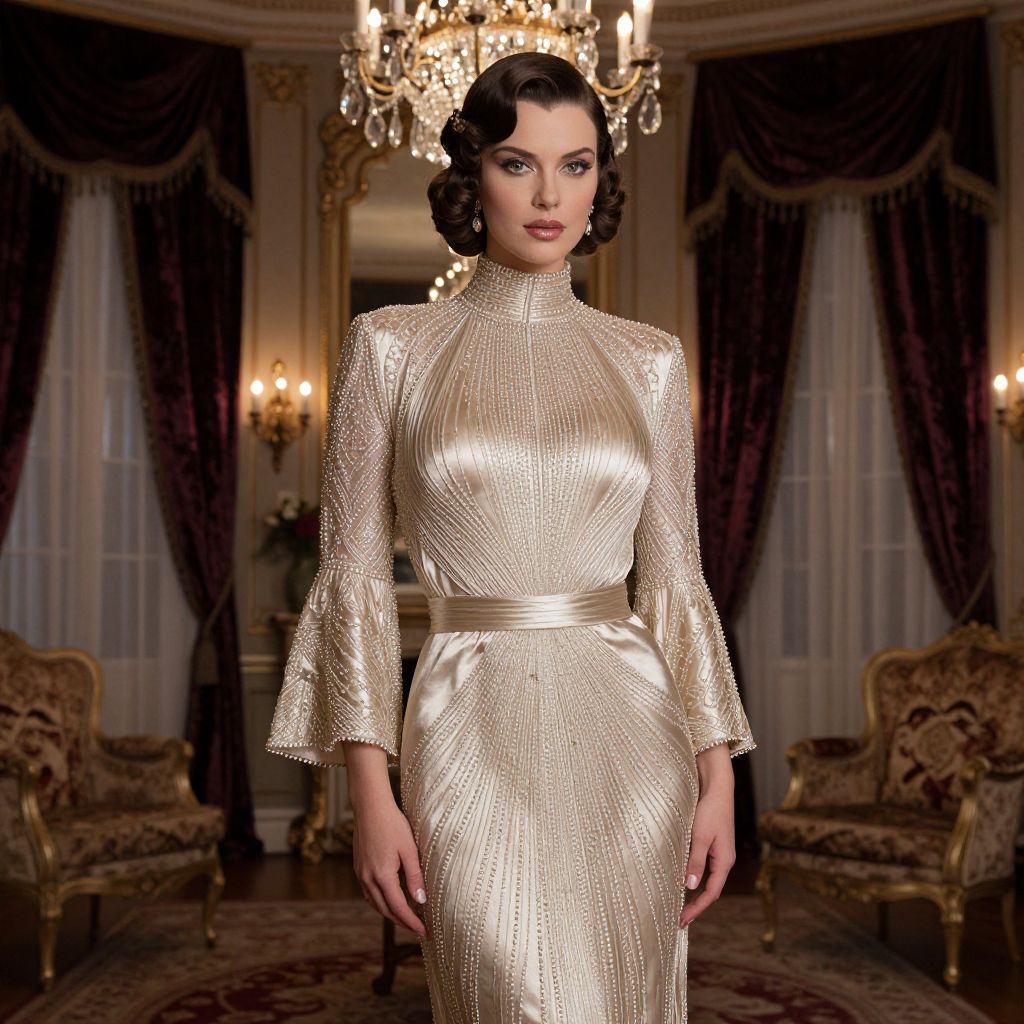 A stunning woman in her 30s with sharp cheekbones, high forehead, and elegant green eyes wearing a structured 1930s aristocrat outfit — a silk, beaded, floor-length gown with a high collar, tailored waist, and flared sleeves — standing in a grand, opulent drawing room during the 1930s, with crystal chandeliers, velvet drapes, and vintage furniture in the background, the atmosphere luxurious and refined.. The woman has big tits and cute face