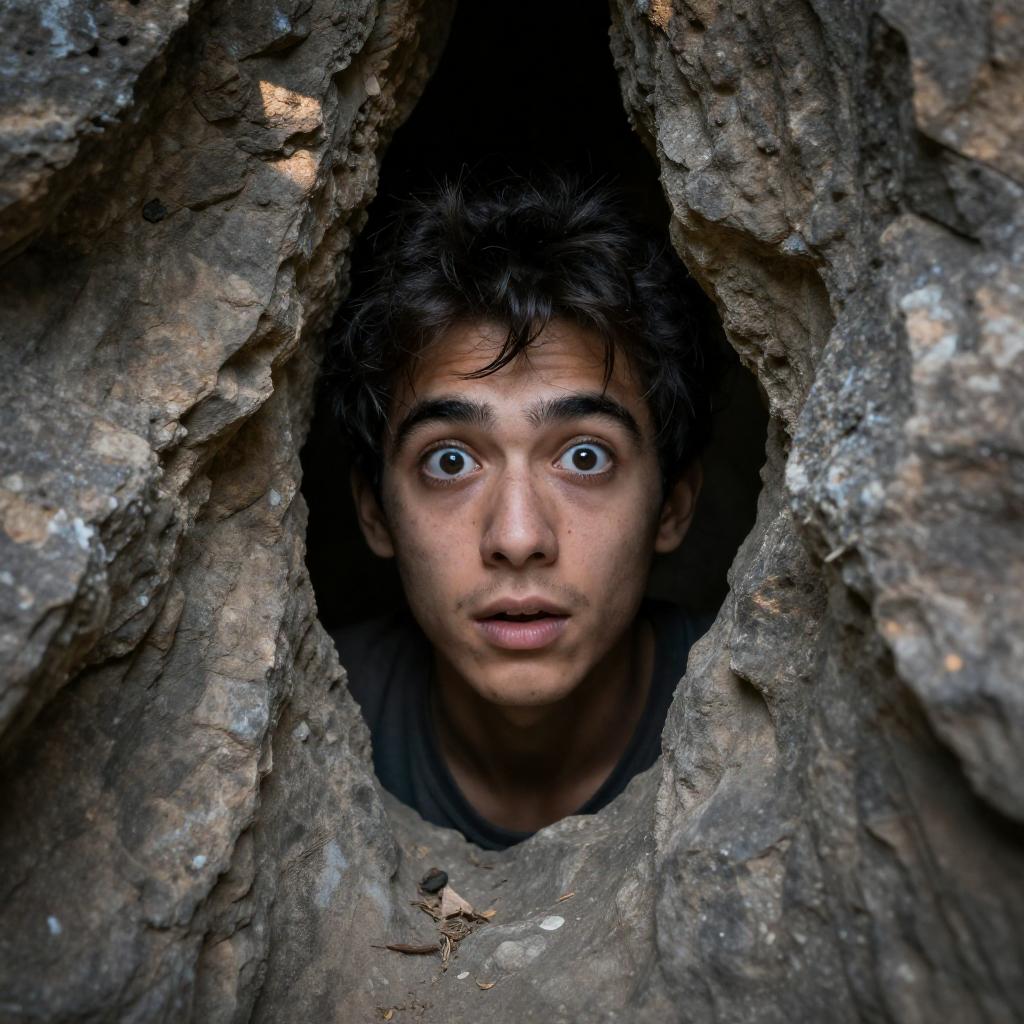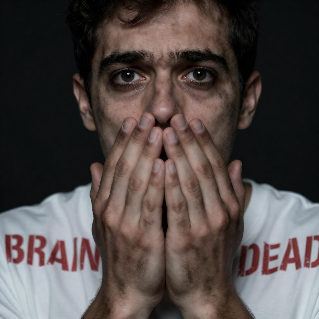 Close-up photograph of a man's face with grimy, blackened hands covering his mouth and nose. His eyes are wide open in fear, and he wears a white shirt with "BRAINED DEAD" in red letters. The background is dark, emphasizing the intense, frightening expression.