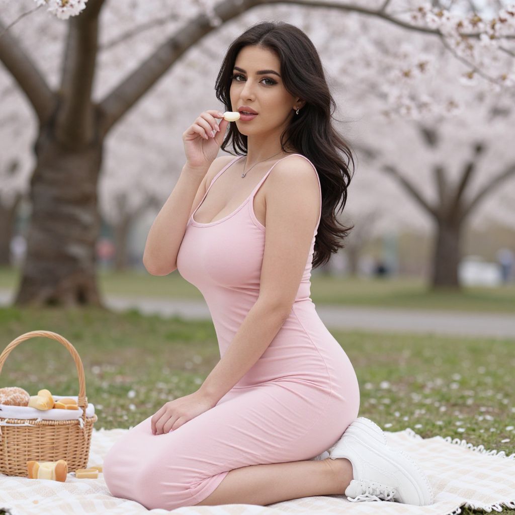 Voluptuous Woman Picnic Under Cherry Blossoms