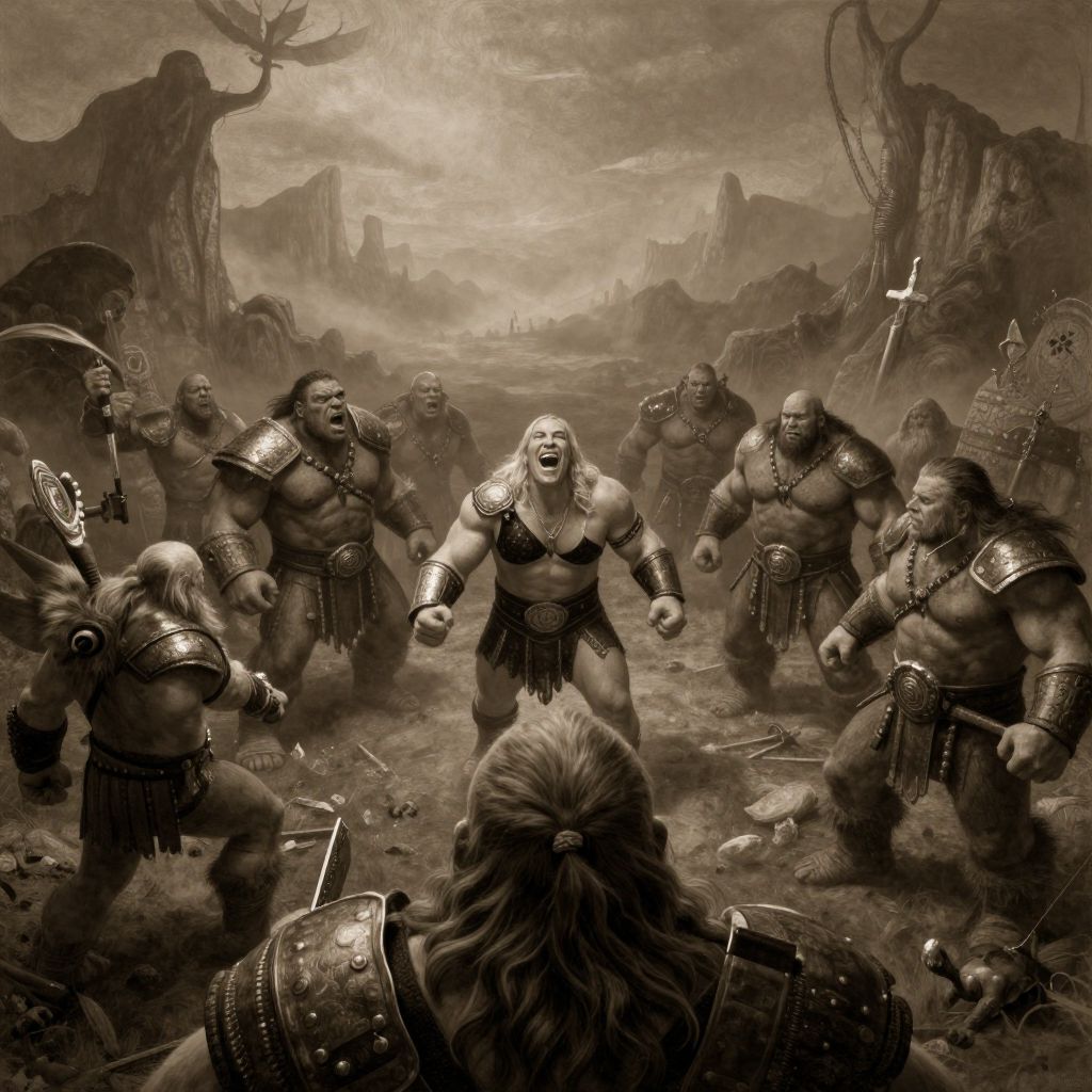 Worm's eye view of braun strowman as a huge hulking viking laughing with fat bald warriors at night in fog, painted by boris vallejo and phil hale and greg rutkowski and norman rockwell and jack kirby and tom lovell and jeremy mann, based on ogre kingdoms by cos koniotis