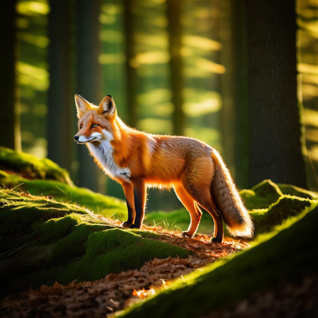 Photorealistic image of a charming red fox standing on mossy ground in a dense forest. The fox's fur is detailed and illuminated by warm sunlight filtering through the trees, creating a vibrant natural scene. The background shows tall tree trunks with a soft-focus effect, emphasizing the fox as the central subject.