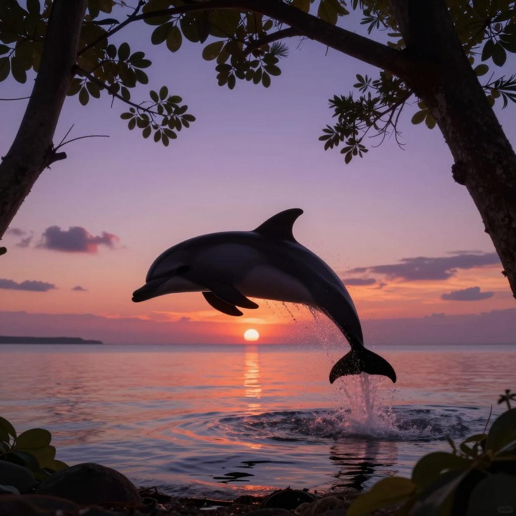 Digital artwork depicting the silhouette of a dolphin mid-jump with its tail fin high in the air, framed by tree branches. The scene features a vibrant sunset casting twilight hues of purple, pink, and orange over a calm body of water surrounded by foliage.