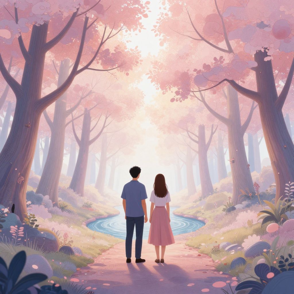 A man and woman stand on a path in a pastel, gradient forest, surrounded by detailed, magical trees and a winding river.