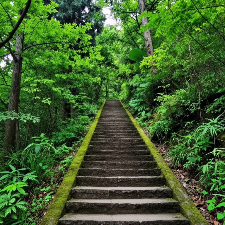 Winding stone steps ascend through a lush, verdant forest, flanked by vibrant green foliage, moss-covered earth, and towering trees, inviting a serene journey into the heart of nature.