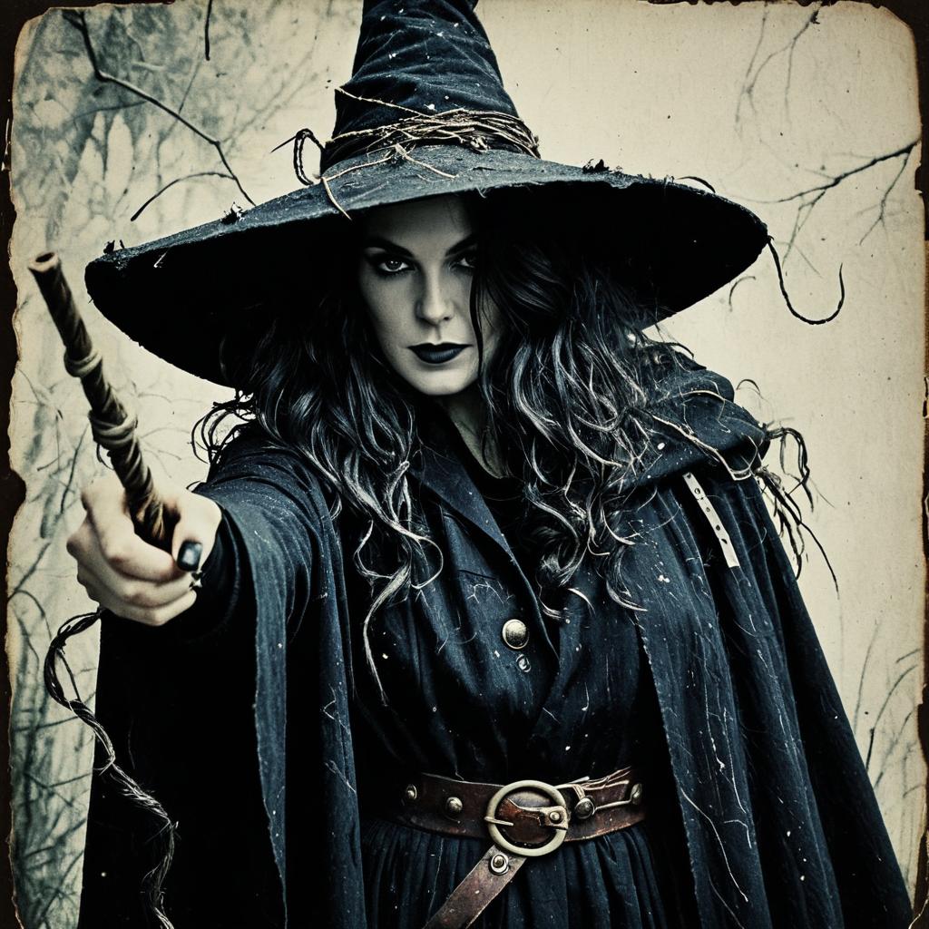 Portrait of a sinister woman dressed as a witch with a tattered dark cloak and wide brimmed hat, wild tangled dark hair, and dark makeup, ominously pointing a wand towards the camera in a gloomy outdoor setting with bare trees.