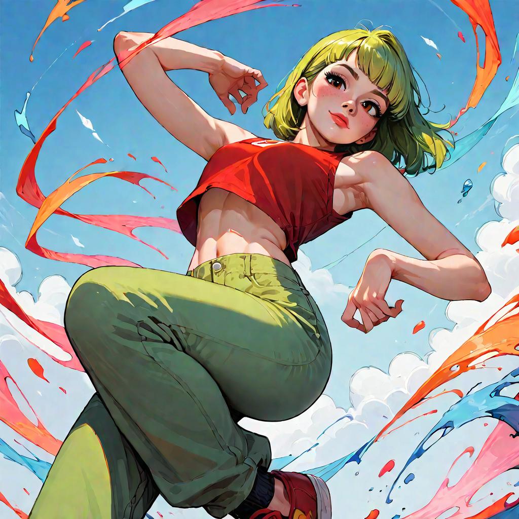 Score_9, score_8_up, score_7_up, (penny \(inspector gadget\):1), flatchest, sexy pose, exposed midriff, red shirt, stripe, green pants, solo, source anime, highly detailed