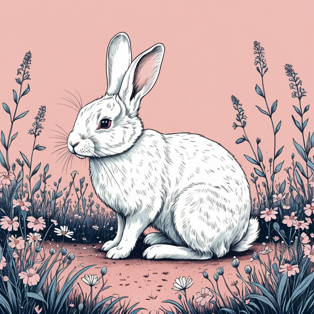 Hand-drawn illustration of a white rabbit sitting calmly on the ground, surrounded by delicate wildflowers. The artwork features a soft pastel pink background with detailed clean lineart, subtle shading, and a minimalistic gentle atmosphere. Muted pink and blue color scheme accentuates the calm and serene mood.