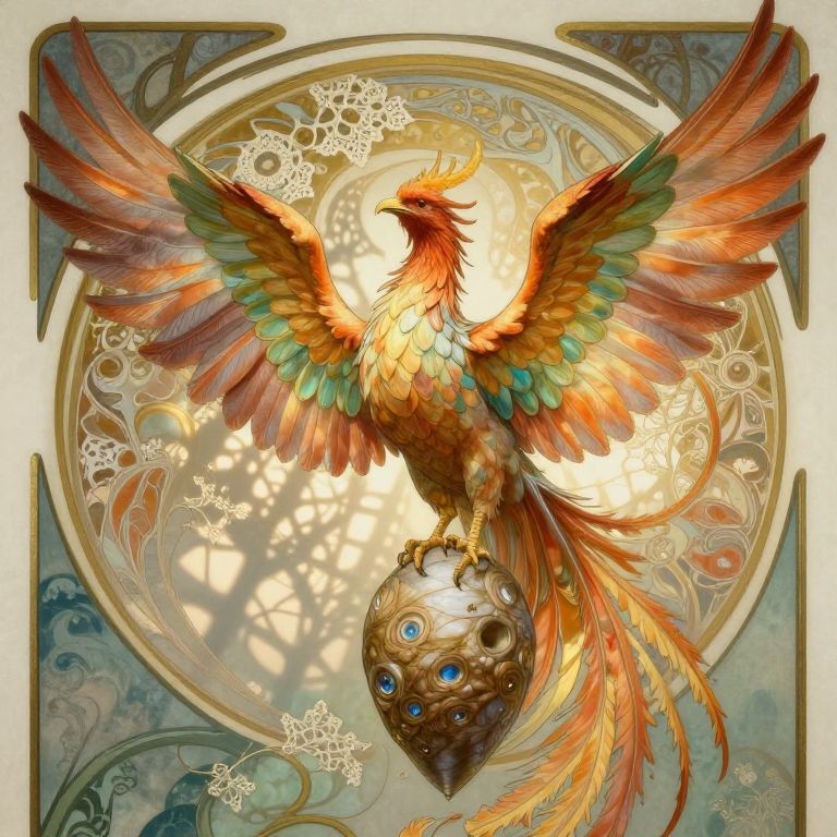 An ethereal portrait of a mythical phoenix in the Art Nouveau style, showcasing the bird's mesmerizing iridescent plumage as it emerges from a cocoon-like chrysalis. The scene is set against an abstract background of flowing curves and organic patterns, symbolizing transformation and rebirth. As light gently filters through delicate lace-like foliage, the phoenix's majestic wings slowly unfurl, casting intricate shadows that dance across the backdrop, evoking a sense of wonder and hope as it prepares to take flight into a new chapter in its extraordinary life story.