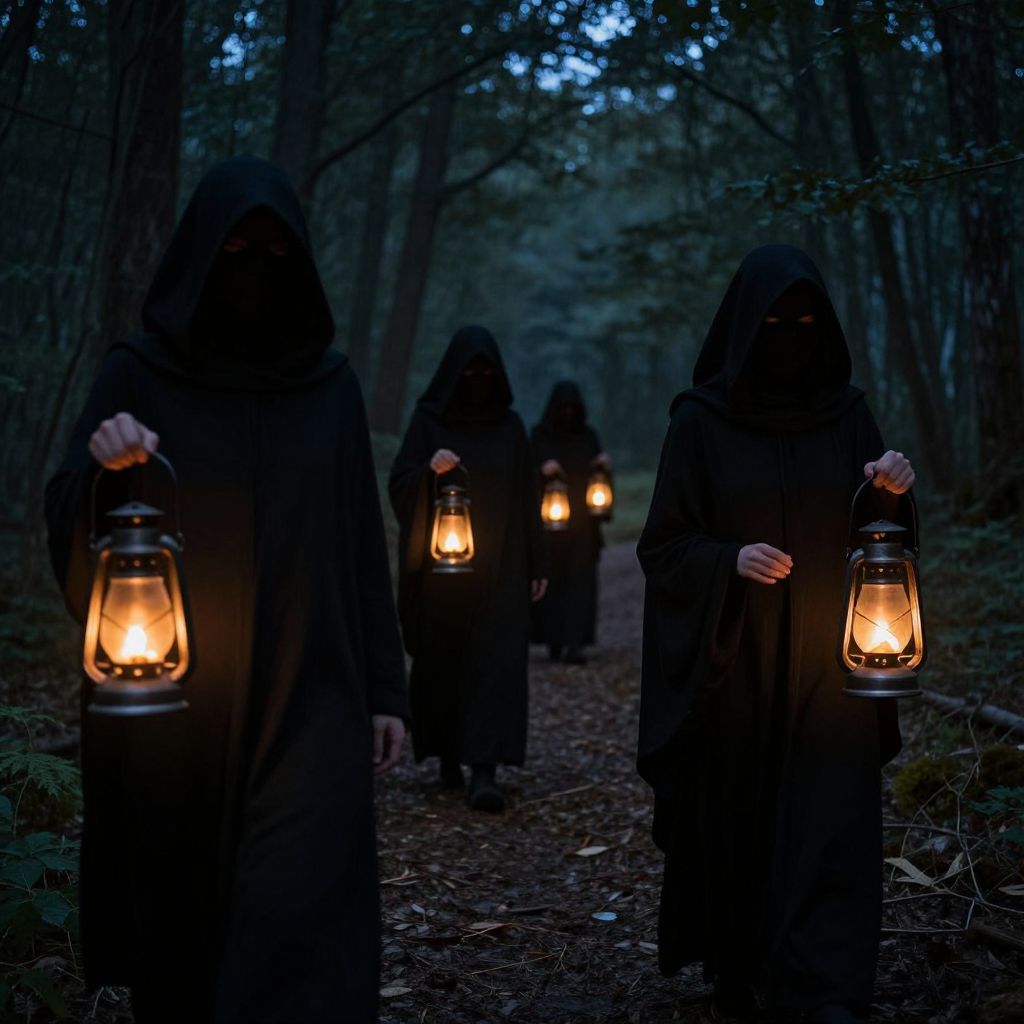 A cyberpunk-inspired digital artwork depicts a moody, atmospheric alleyway where cloaked figures carry glowing glass jars, their silhouettes blending into the dimly lit urban landscape adorned with string lights and vintage-style lanterns, evoking a dreamlike, otherworldly ambiance.