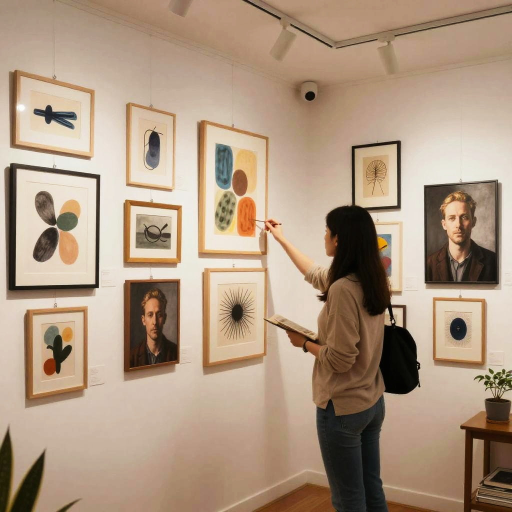 Open art hobbyist displaying diverse artwork in an inviting personal gallery at home, walls adorned with abstract, realistic, and experimental pieces, warm lighting enhancing textures, evoking a journey of personal growth and artistic exploration
