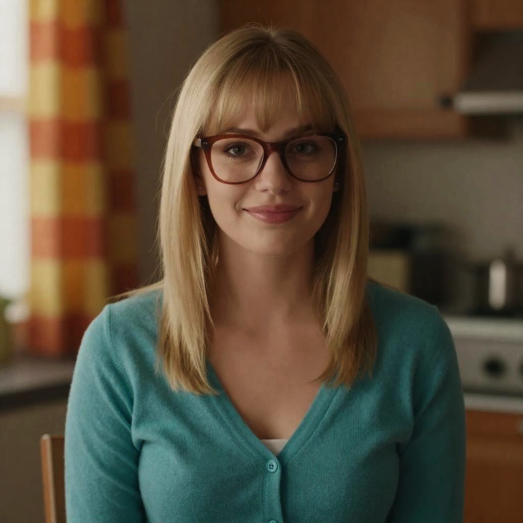 Photograph of a young woman with fair skin, shoulder-length blonde hair, and bangs, wearing large brown glasses and a teal cardigan. She has a subtle, slightly amused smile. Background features orange and yellow patterned curtains and a blurred kitchen area. She is seated and facing forward. The lighting is warm.