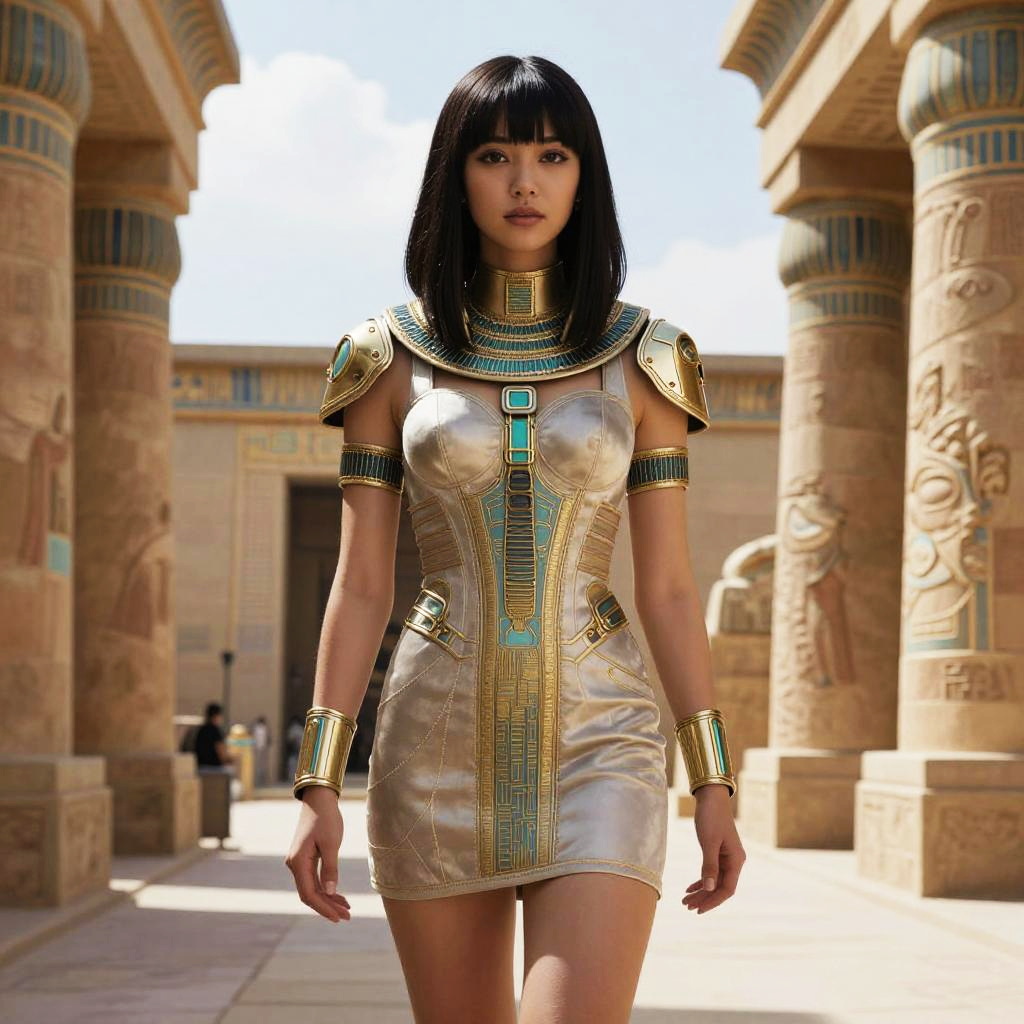 East Asian woman with long black hair, wearing a yellow ancient Egyptian-style dress and headpiece, standing in front of lush green foliage.