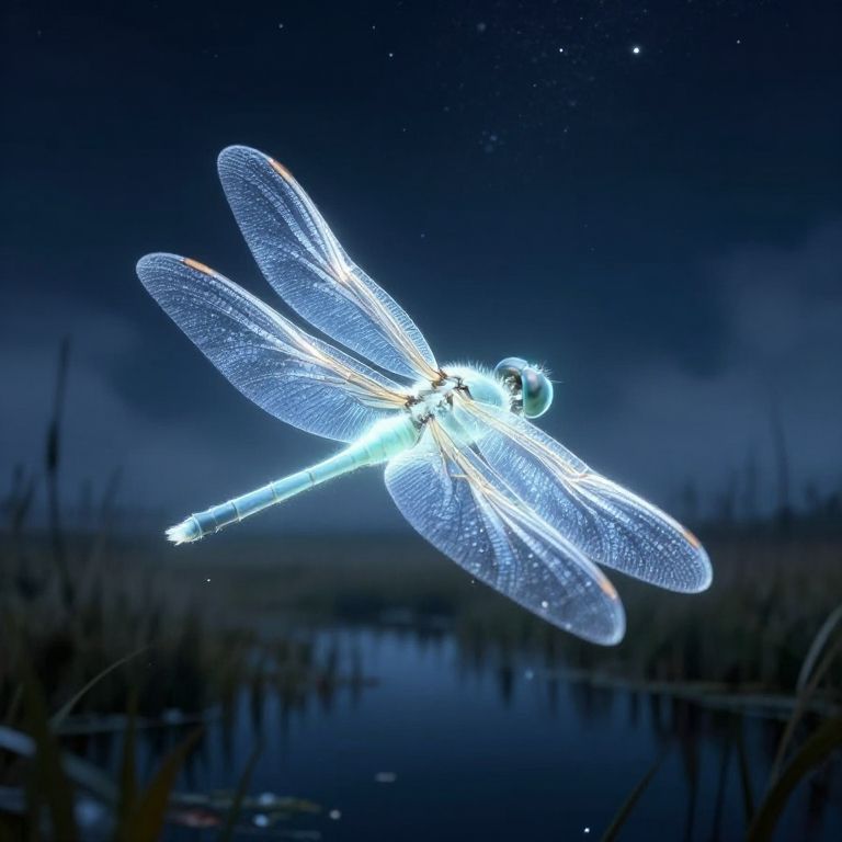 Flighing bioluminescent dragonfly with translucent glowing wings, skimming above a smoky marsh under a starry night sky, ethereal atmosphere, highly detailed close-up, emphasizing delicate wing patterns and reflective water surfaces, fantasy art style.