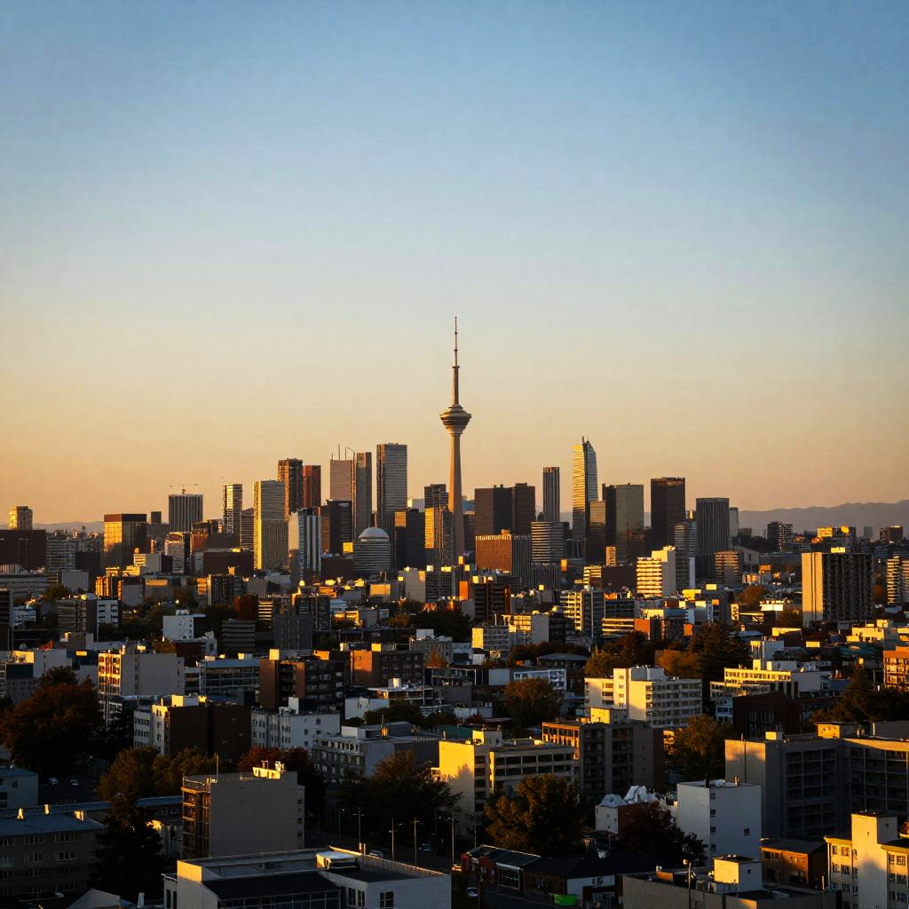 Photograph of a cityscape at sunset, showcasing a sprawling urban area bathed in golden light. The sky transitions from bright blue to soft yellow near the horizon. A tall, slender tower with a white structure at the top is visible in the distance. The city is densely packed with buildings, creating a patchwork of lights and shadows. The image has a slight vignette effect on the edges.