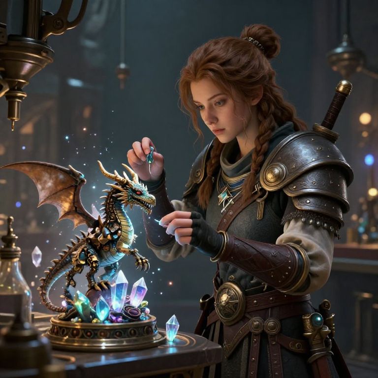 A highly detailed digital painting depicts a young woman with fair skin and long, wavy auburn hair in braids, wearing medieval-style, metallic armor and a dark brown tunic. She is focused on a small, glowing, blue crystal dragon on a pedestal, holding a tiny blue crystal in her right hand. The dragon has intricate, metallic wings and is surrounded by bright, crystal-like orbs. The background is a dimly lit, medieval workshop with blurred, warm-toned lighting and metallic fixtures. The woman's expression is concentrated, and the scene has a magical, fantasy vibe.